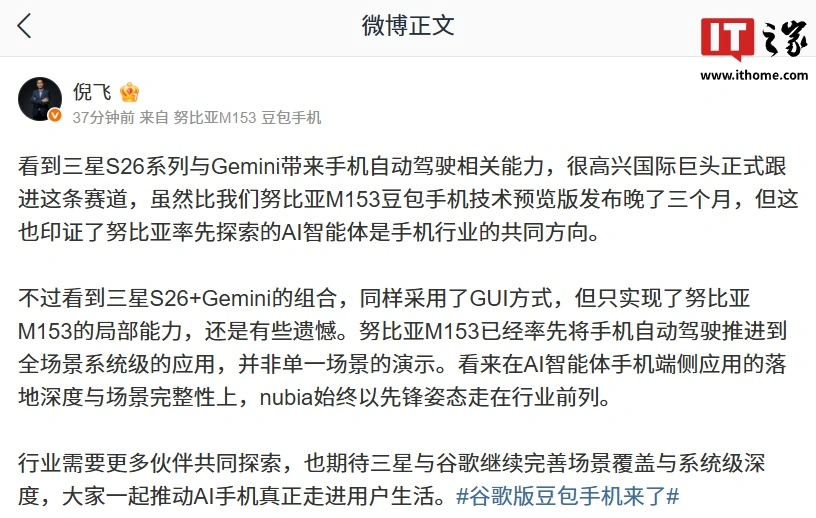 IT之家驻防到,中兴通信结尾业绩部总裁、努比亚手艺有限公司总裁倪飞本日发文谈及了三星的新品发布会。他暗意,看到三星 S26 系列与 Gemini 带来手机自动驾驶联系才略,很沸腾国外巨头跟进这条赛说念,诚然比努比亚 M153 豆包手机手艺预览版发布晚三个月,但也印证了 AI 智能体是行业共同标的。