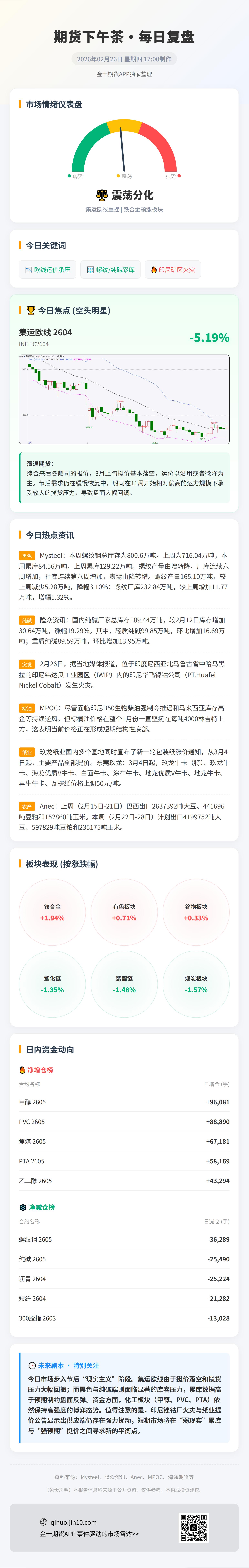 海通期货默示,概括来看各船司的报价,3月上旬挺价基本摧毁,凤凰彩票官网app运价以沿用好像微降为主。节后需求仍在平安复原中,船司在11周启动相对偏高的运力限制下承受较大的揽货压力。从来去逻辑来看盘面回想基本面订价,以弱执行为主导,后续不雅察3月中旬船司是否有新一轮的挺价算作,以及现货端本色降幅的变化,瞻望全体偏弱动荡为主。